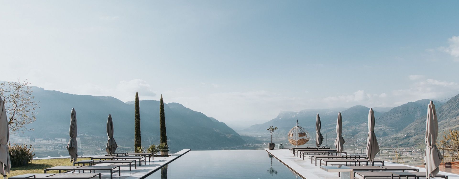 The view from the pool: unique and breathtaking. Below you, the Merano region in all its beauty. The mountains within reach. You, right in the middle of it all. The outdoor panorama salty water infinity pool is heated all year round, filled with spring water from the Spronser Valley and salt from Sardinia. Immerse yourself in the special la dolce vita feeling in Dorf Tirol.