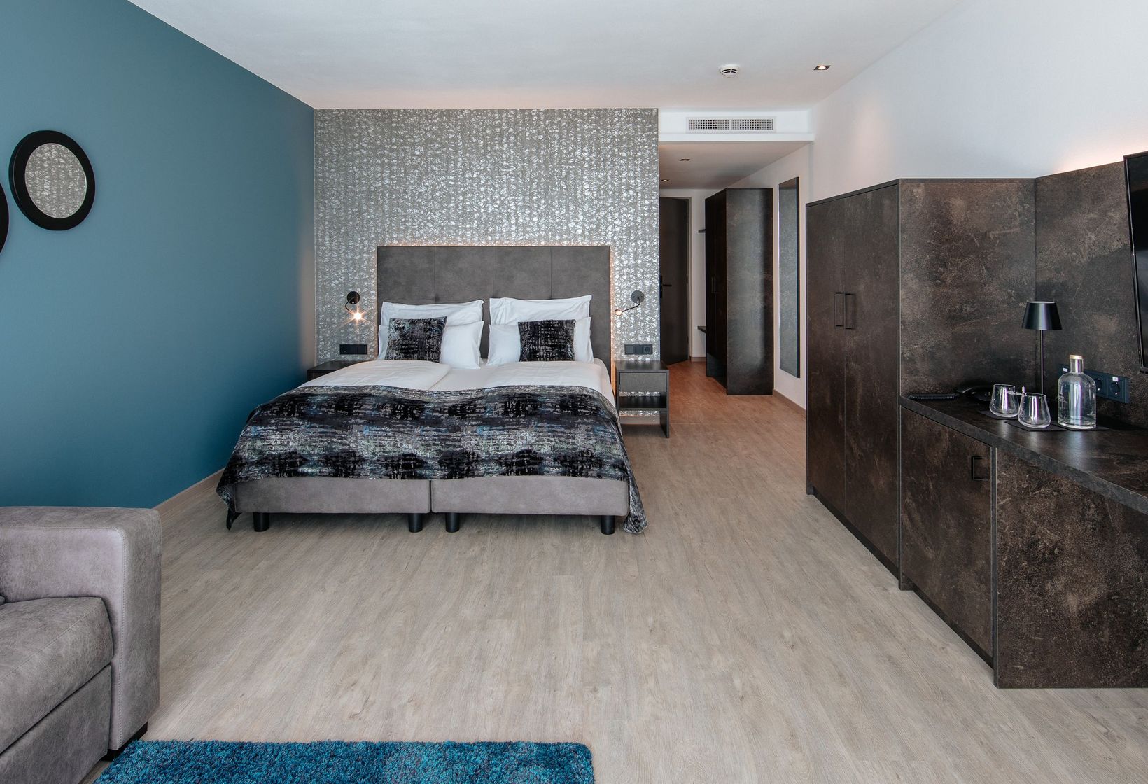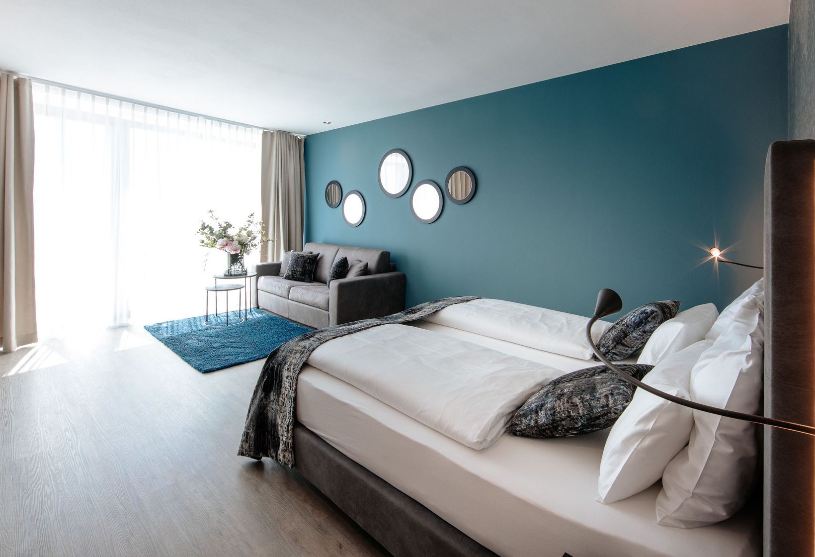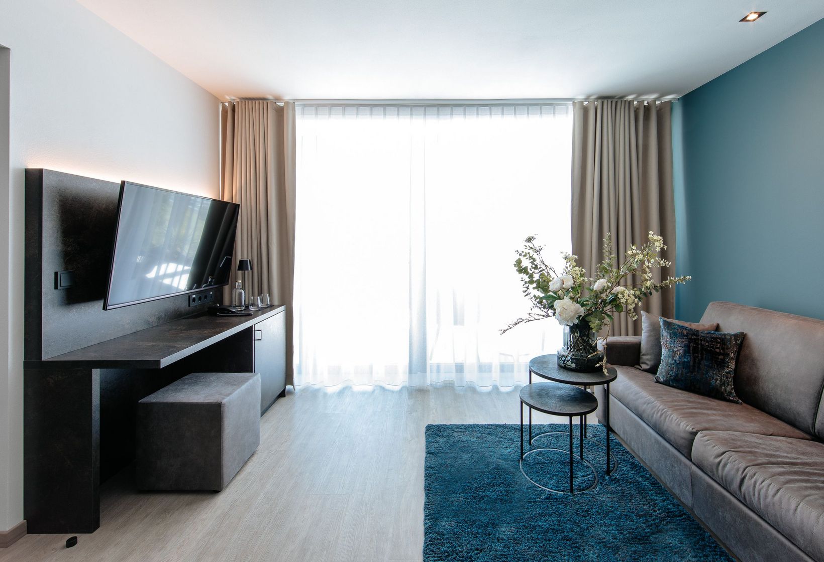 Bedroom with box-spring beds with premium mattress, high-quality parquet flooring, living area with pull-out couch, bathroom with washbasin, walk-in shower, hairdryer, cosmetic mirror & exclusive cosmetic products, separate WC & bidet, personal bathrobe, sandals, pool towels & spa bag, desk & closet from local carpenter, air-conditioning, satellite TV, safe, telephone, minibar, free WLAN, outdoor covered parking slot (garage for an extra charge).