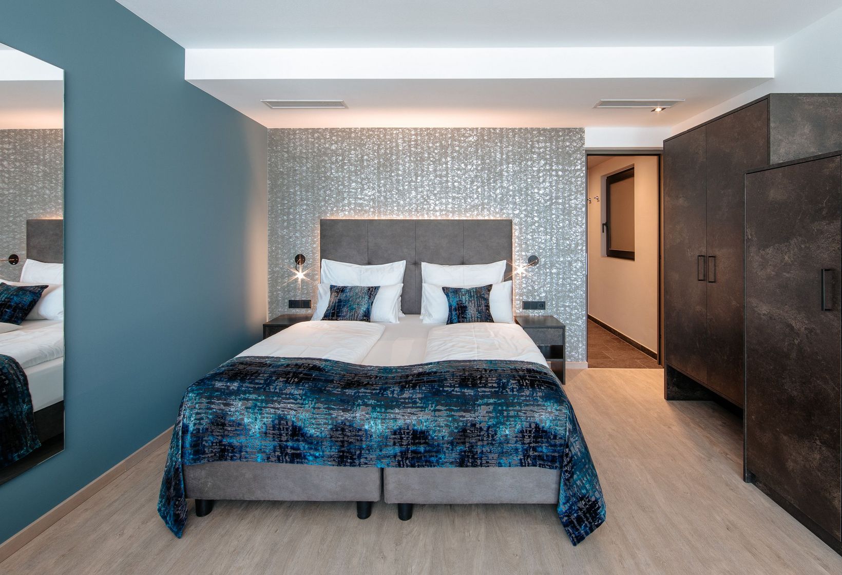 2 bedrooms with box-spring beds with premium mattress, high-quality parquet flooring, living area with pull-out couch, bathroom with washbasin, walk-in shower, hairdryer, cosmetic mirror & exclusive cosmetic products, separate WC & bidet, personal bathrobe, sandals, pool towels & spa bag, desk & closet, air conditioning, satellite TV, safe, telephone, minibar, free WLAN, free garage parking space.